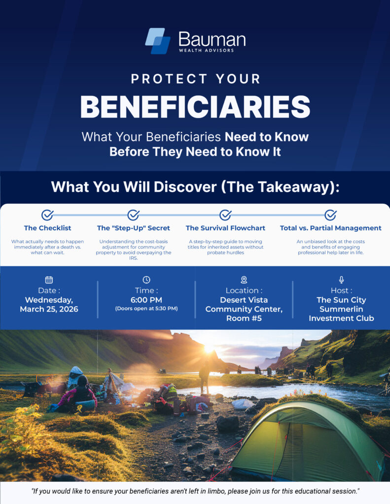 The March meeting of the Investment Club will be held on Wednesday, March 25th at 6:00 pm at Desert Vista. Our speaker is from Bauman Wealth Advisors. Bauman will be speaking on the topic of “Protect Your Beneficiaries.” Bring a friend and find out together how to preserve your estate assets so that your beneficiaries actually get them as you intended. Refreshments will be served. Please RSVP via email to scspf.club@gmail.com.